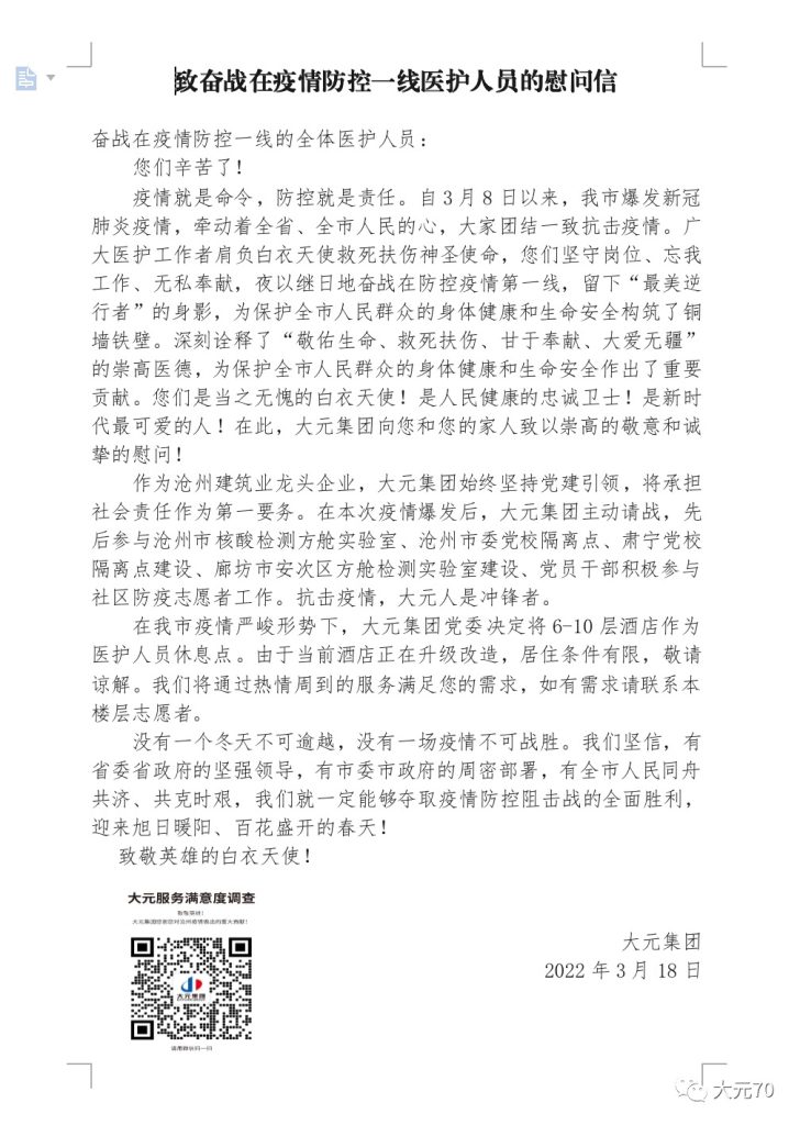 由于酒店正處于改造升級階段,條件有限,為保障滿足醫護人員的需求,提供熱情周到的服務,各項工作做深做細。在集團內部召集11位志愿者,大元實業集團宋偉劍、代立偉、王艦洋、楊廣達、邵宇、楊志濤、呂鵬宇,元正文旅集團張明明、劉亞敏,二建公司豐美美,生態公司呂艷杰,不顧個人安危,勇當志愿者,為醫護人員提供24小時服務,進行全封閉管理,分布在各樓層。集團黨委為全體醫護人員準備了《致奮戰在疫情防控一線醫護人員的慰問信》和《大元人》內刊,同時附上大元集團服務滿意度調查二維碼和WiFi密碼。在各樓層進行防疫知識、文化用語宣傳上墻。表達大元集團對抗疫醫護人員的誠摯問候和敬意,積極營造萬眾一心、全力抗疫的濃厚氛圍。