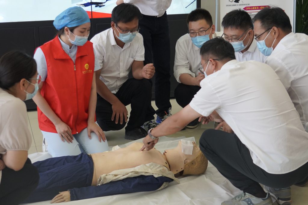 最后,王主任現(xiàn)場(chǎng)演示心肺復(fù)蘇、包扎等應(yīng)急救護(hù)技術(shù),并邀請(qǐng)現(xiàn)場(chǎng)員工上臺(tái)配合,為集團(tuán)員工上了一堂生動(dòng)的急救課。