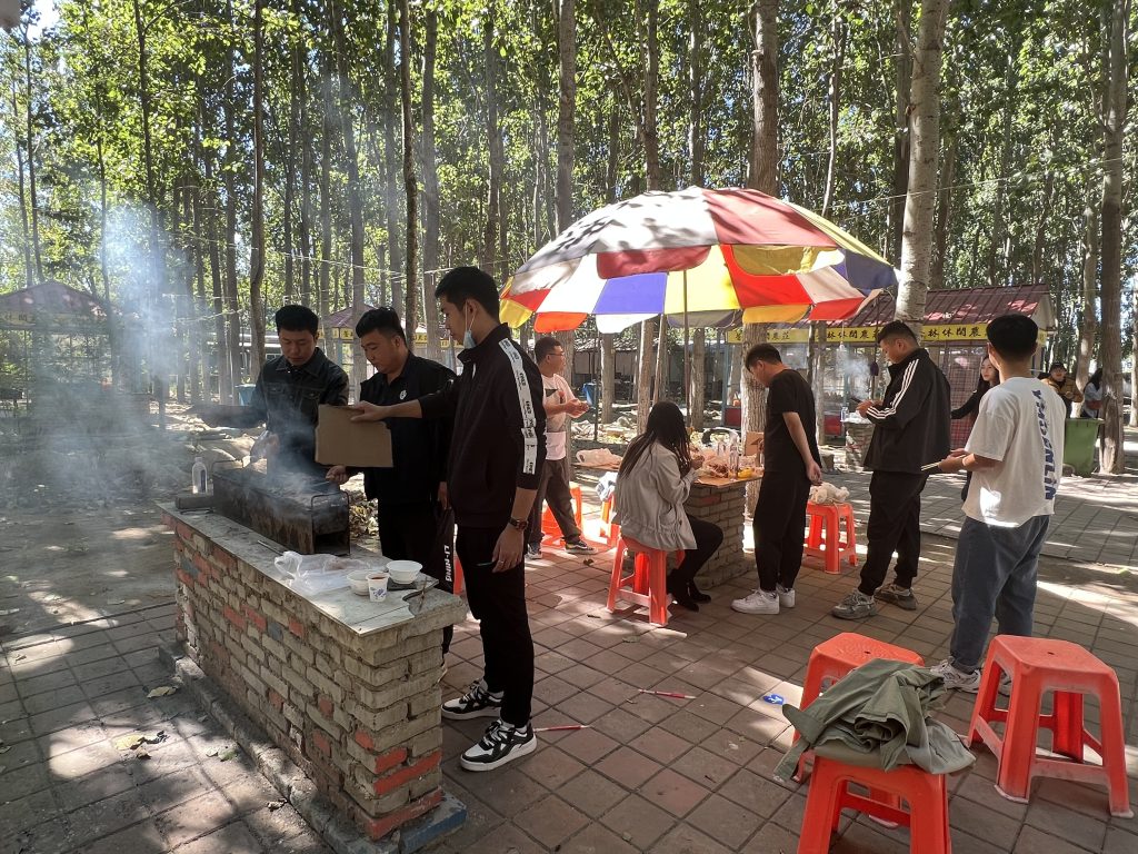 午餐環節,大家聚集在燒烤場地,按照預先的分組落座。領材料,加炭起爐子,準備燒烤,忙的不亦樂乎。大家邊烤邊吃、邊吃邊聊,更有青年臨場發揮,主動參加歌唱表演,現場氣氛洋溢著青春激情。